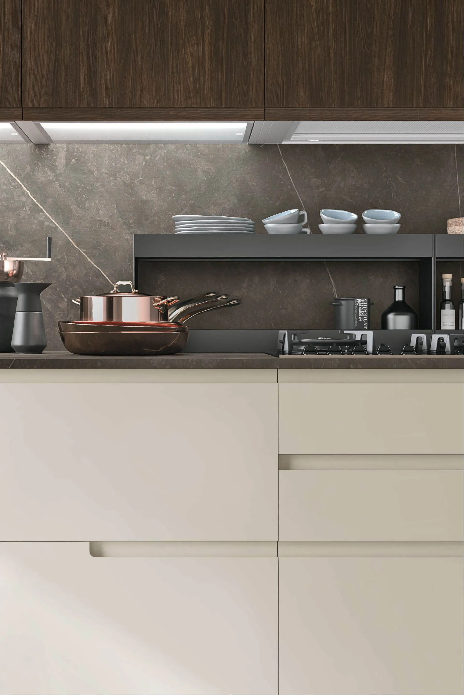 L’anta da 60 cm e il cestone da 36 cm possono avere la maniglia integrata continua o parziale. Questo dettaglio estetico permette di dare dinamismo ai frontali della cucina creando dei giochi di linee che mantengono comunque intatta la funzionalità.